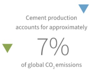 Traditional cement, typically known as Portland cement, is composed of “clinker” that is produced in high temperature kilns fueled by coal, natural gas and other petrochemicals, and wastes (e.g. tires) to heat the cement mix and calcine (heat treat it) to transform it into a cementitious material. This process emits a high amount of carbon dioxide per ton of cement product, both as a consequence of emissions from limestone calcining and the fuel combustion.